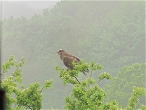 Unfortunately, I had no camera with me, so all I can offer by way of compensation are a couple of photos taken from indoors (apologies for the window latch) in early May this year. On that day, a buzzard managed to maintain its precarious perch on a hazel tree for several minutes in windy, wet weather. Magical in its own way.