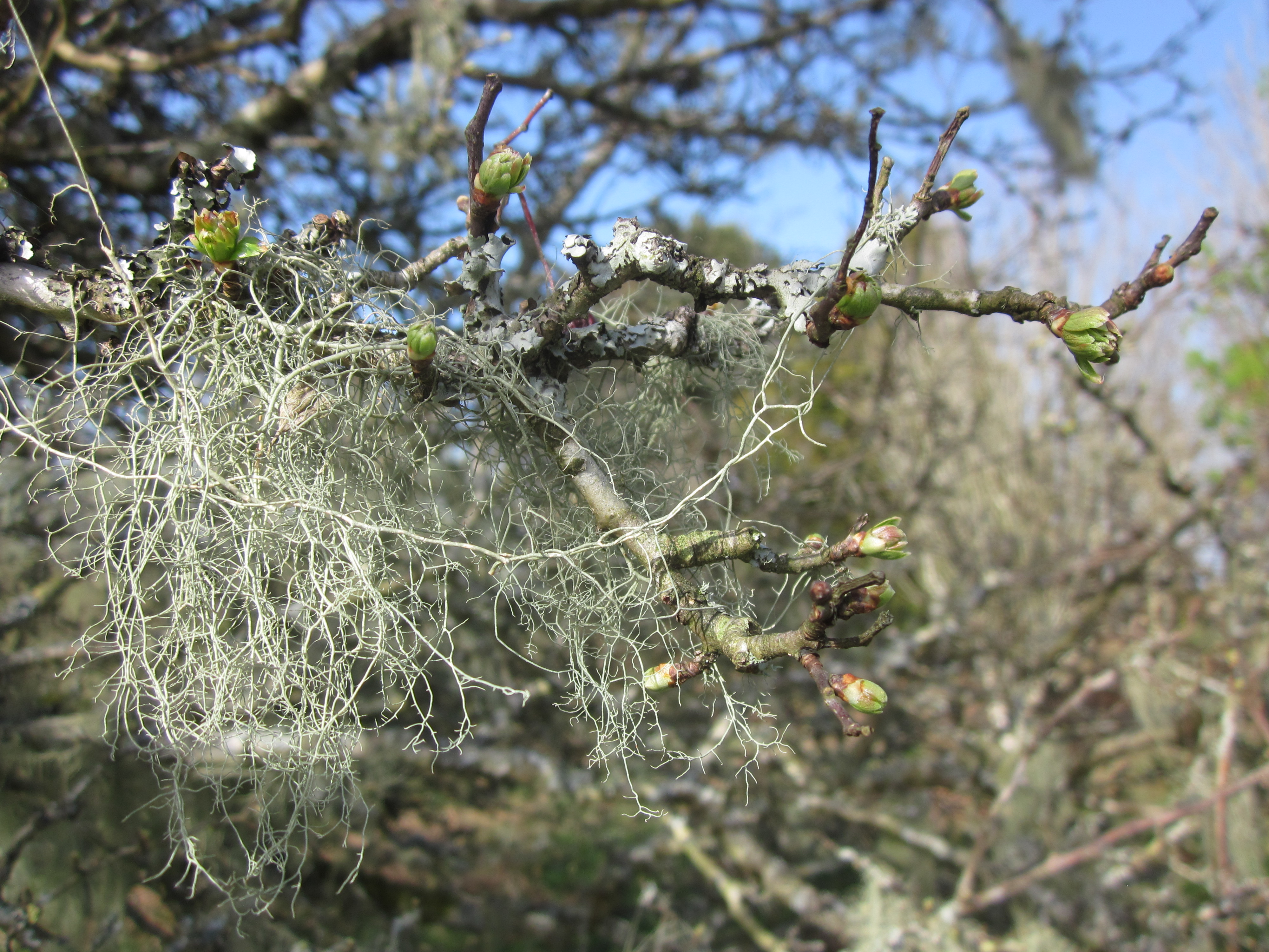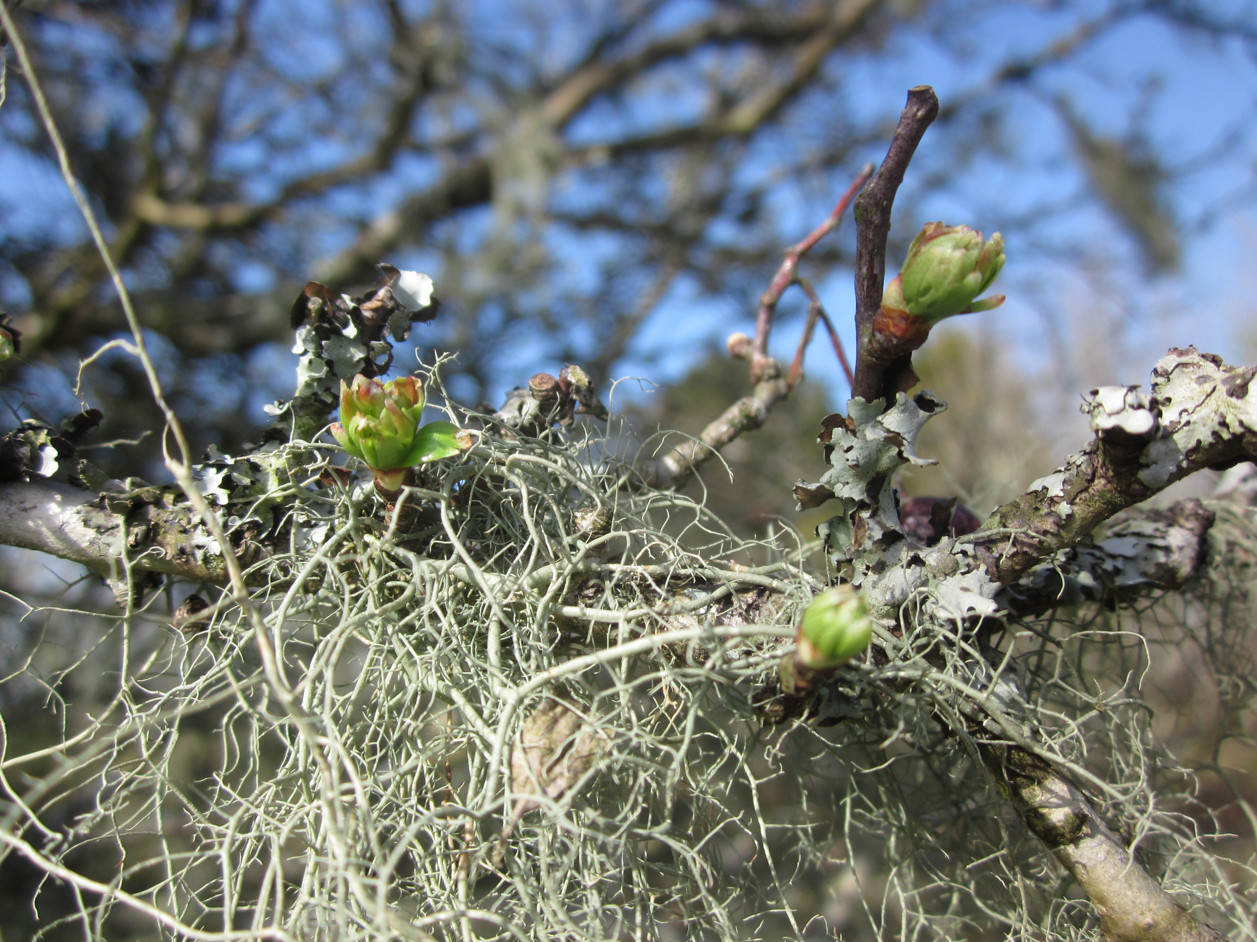 On an exposed edge of the wood stands a twisted hawthorn.  It’s been shaped by the elements, yet also defies them. At this time of year, old Rothko-red berries survive next to new green buds.  It also plays host to a profusion of lichen, like no other tree in the vicinity. Here are a few shots taken yesterday with the Ixus.