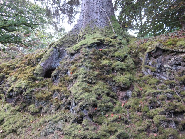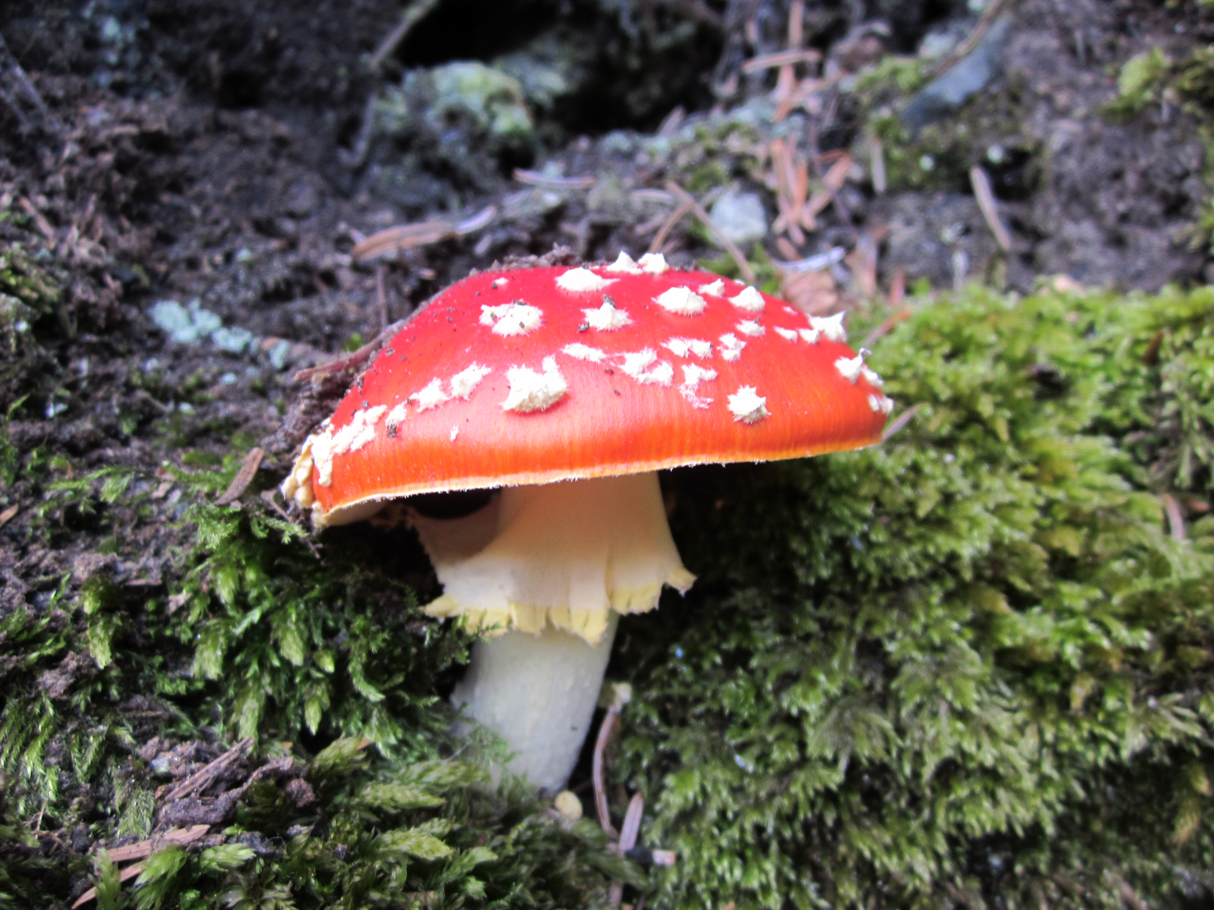 Look what my Ulster-Canadian friends and I spotted yesterday, down in the dell.  I didn’t see it at first, but then I clambered up for a closer look.   This adolescent Fly Agaric, with its flouncy underskirt, was mighty purty.