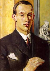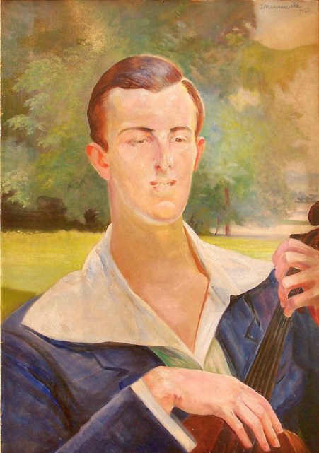 This is probably a less familiar image than the previous one by Augustus John, and there’s less evidence of a cello! In Portrait of a Man with Cello (1923), the Polish painter Jacek Malczewski (1854-1929) depicts the young man strumming the instrument like an upright guitar or a lowered violin. His languorous manner, slicked-back hair and exaggeratedly broad shirt collar, combined with the landscape, suggest nothing less than a weekend in the country along with a spot of music-making, don’t-ya-know. To my untrained eye, the man bears a striking resemblance to a previous portrait that Malczewski had made of his son Rafał (below). (Rafał also made a career as a painter, but he is best remembered as one of Poland’s most distinguished skiers and mountain-climbers. In 1917, he narrowly escaped death in the Polish Tatras. This portrait dates from that year.)