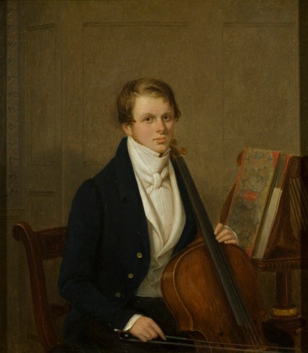 I was particularly drawn to this small oil painting by Rippingille, mainly because it offered a new image to add to my occasional posts on ‘The Cello in Art’ (see below). This portrait (c.1829) is of a well-to-do young man, dressed ‘to the nines’. He was John Whitmore Isaac from Worcester (1808-84), so he was then about 21. Isaac is holding the instrument naturally, which suggests that he may well have been a cellist himself. His bow-hold is not on the ‘frog’ but further along the stick, which recalls the practices of the 18th century, as demonstrated in a portrait of the composer and cellist Luigi Boccherini (1743-1805).