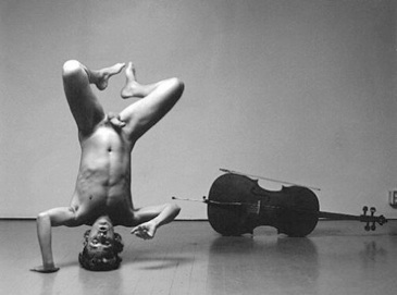 OK, I know that stretching exercises before breakfast are a good thing, but this is a bit extreme. I have no idea who this is, or whether he’s even a cellist, but he’s a welcome tonic after the po-faced players of yesterday. A jolly nude dude, no less.