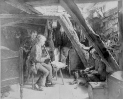 Quintet is the best-known of these works, although it currently languishes in the vaults of the Victoria & Albert Museum in London. Dated between 1888 and the early 1890s, it has various titles, including Quintette der Gehilfen des Stadtpfiefers (there is a trombone hanging on the rear wall). The poor domestic interior is typical of such group pictures and belongs to the same European genre that gave rise to the much more visceral The Potato Eaters, which Van Gogh painted a few years earlier.
