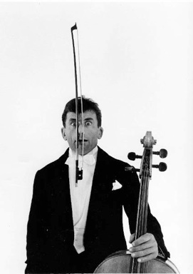 I’ve just come across another historic clip, but one which is viewable only on a French site (ina.fr). Click on the thumbnail image below. It’s a recording from what seems to be a French TV variety show and was broadcast by RTF on 12 May 1958. It’s a 6’ sketch called Le Quatuor, which comprises four cellists (not the standard quartet line-up), with the three on the left playing straight men to Baquet’s clowning. Doisneau’s image above reappears halfway through Baquet’s routine. It may seem a bit dated now, but his comedic imagination is sharply honed, as is his command of the cello. He really could play!