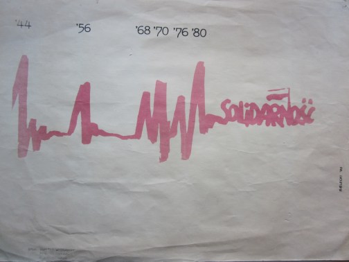 Mementos of the Solidarity period became even more iconic: badges, publications, photographs, posters.  I had visited Warsaw in September 1981, not only to attend the ‘Warsaw Autumn’ festival but also to experience the excitement and activism of the Solidarity movement.  I visited one of the Union’s headquarters and while there bought a number of items, including a small A3 poster that quickly became a prized possession.  My copy of ‘Kardiogram’ is now a bit crumpled and faded (it was then a bright Polish red on white), but it still speaks volumes.
